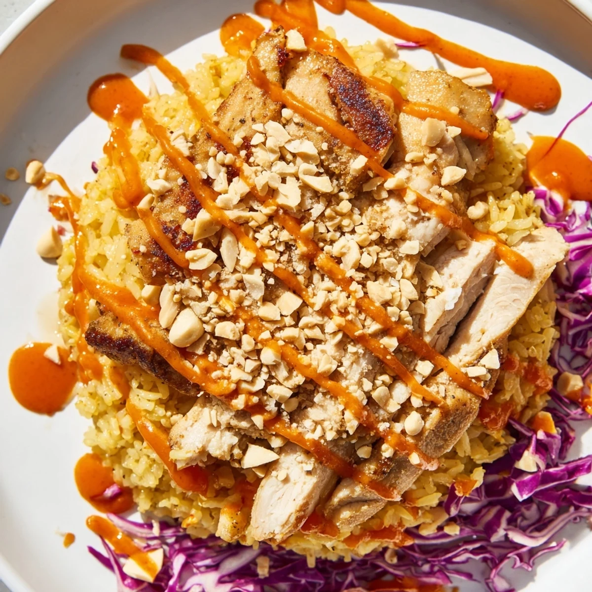 This vibrant bowl combines marinated grilled chicken with golden crispy rice squares for an incredible crunch factor. The fresh vegetable base features shredded romaine, purple cabbage, julienned carrots, and cool cucumber slices, all tied together with that signature creamy Bang Bang sauce—mayo, sweet chili, Sriracha, honey, and fresh lime juice. Top it with roasted peanuts and sesame seeds for extra texture. The key is using cold, day-old jasmine rice pressed into a hot skillet until golden and crackling.