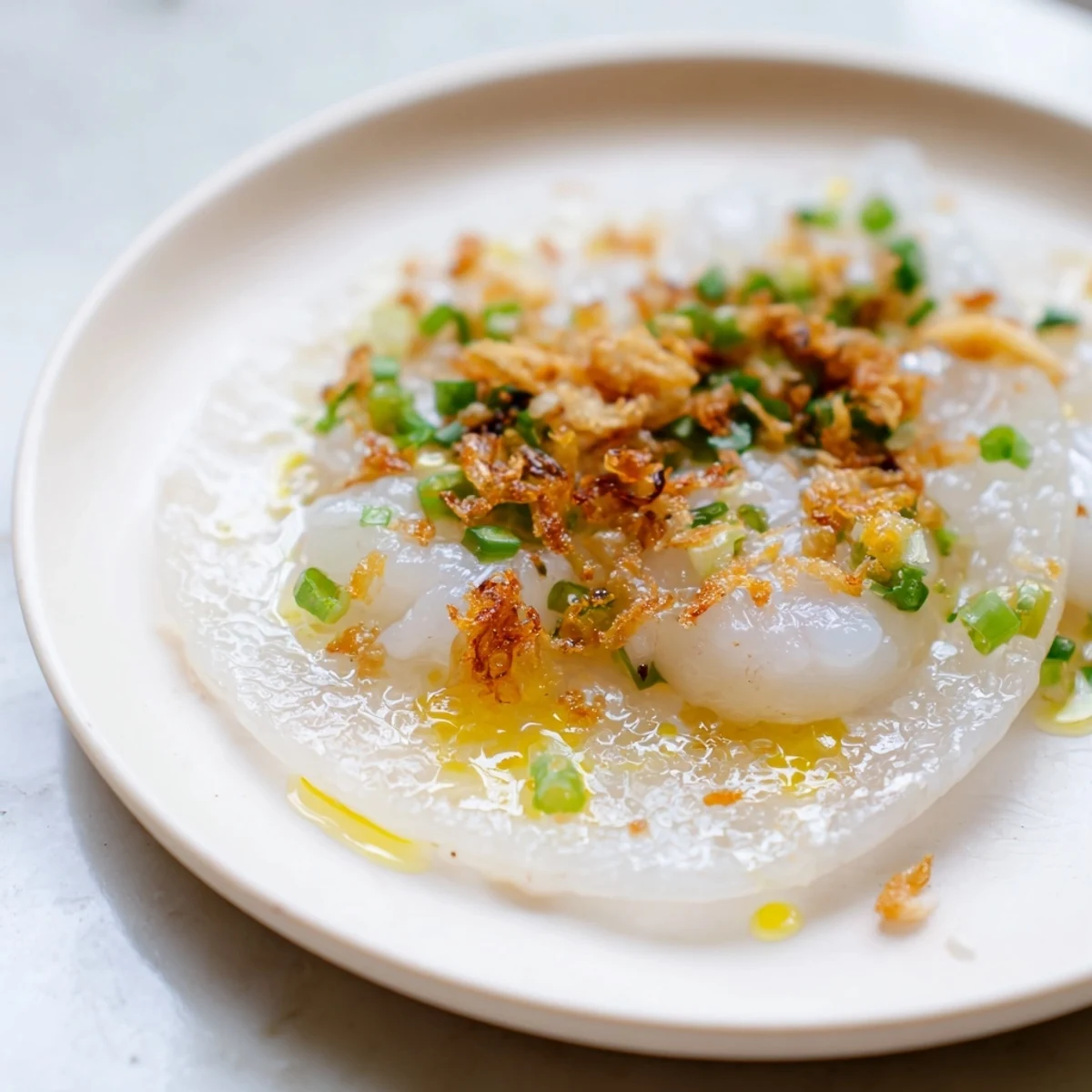 These delicate steamed rice cakes originate from central Vietnam, featuring a silky texture from the rice flour and tapioca starch combination. The dish achieves perfect harmony through its contrasting elements—soft translucent cakes, savory dried shrimp topping, aromatic scallion oil, and the crunch of fried shallots.