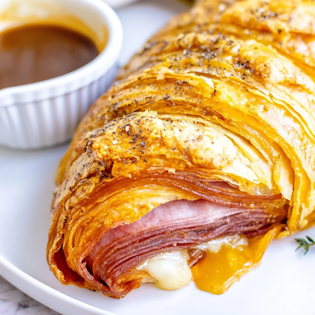 These French dip roll ups feature thinly sliced deli roast beef and melty provolone cheese wrapped in buttery crescent roll dough. Baked until golden, they're served alongside a rich au jus made from beef broth and Worcestershire sauce. Sautéed onions and garlic add aromatic depth.