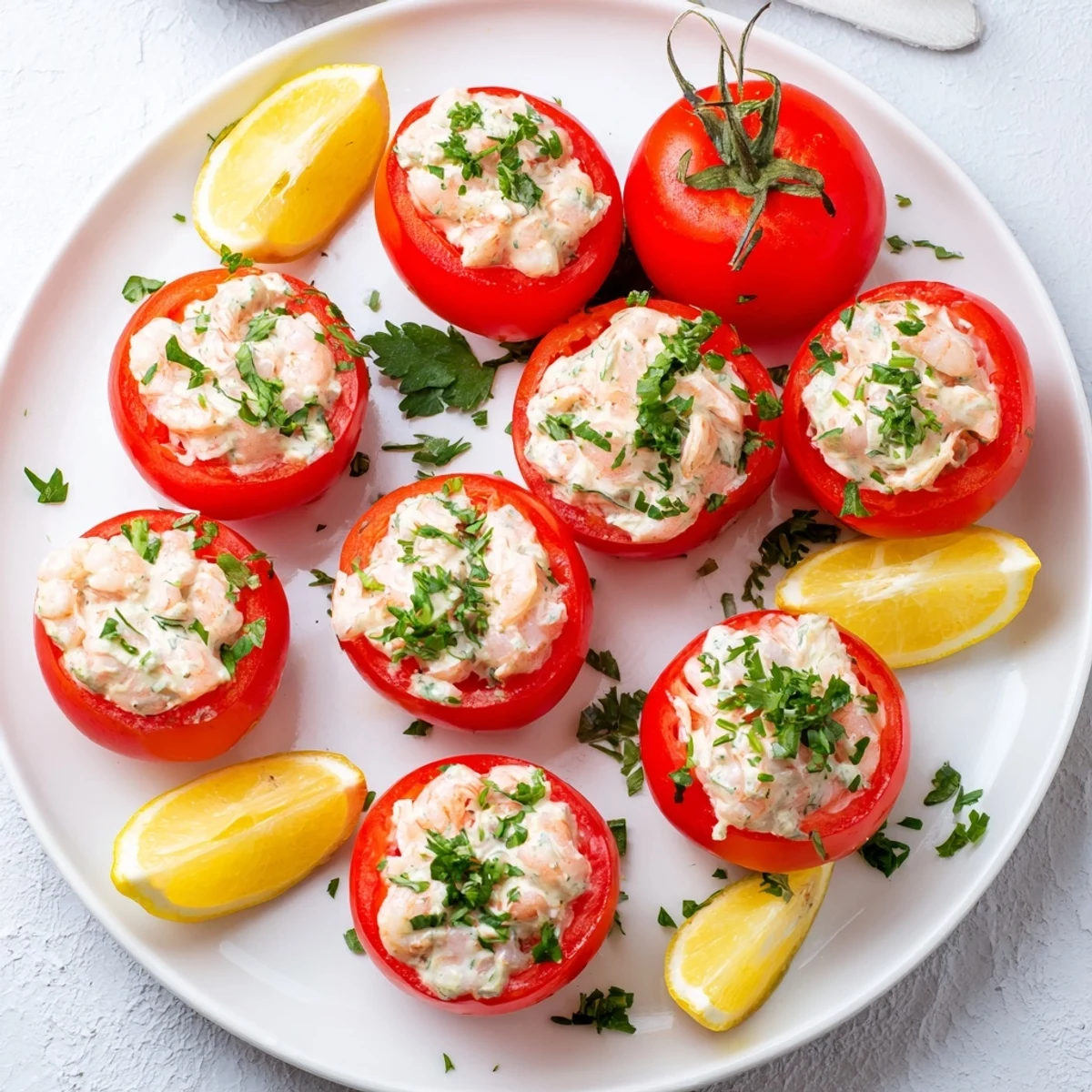 - Pat the tomatoes dry, then pack them generously with the shrimp mixture, mounding it slightly on top