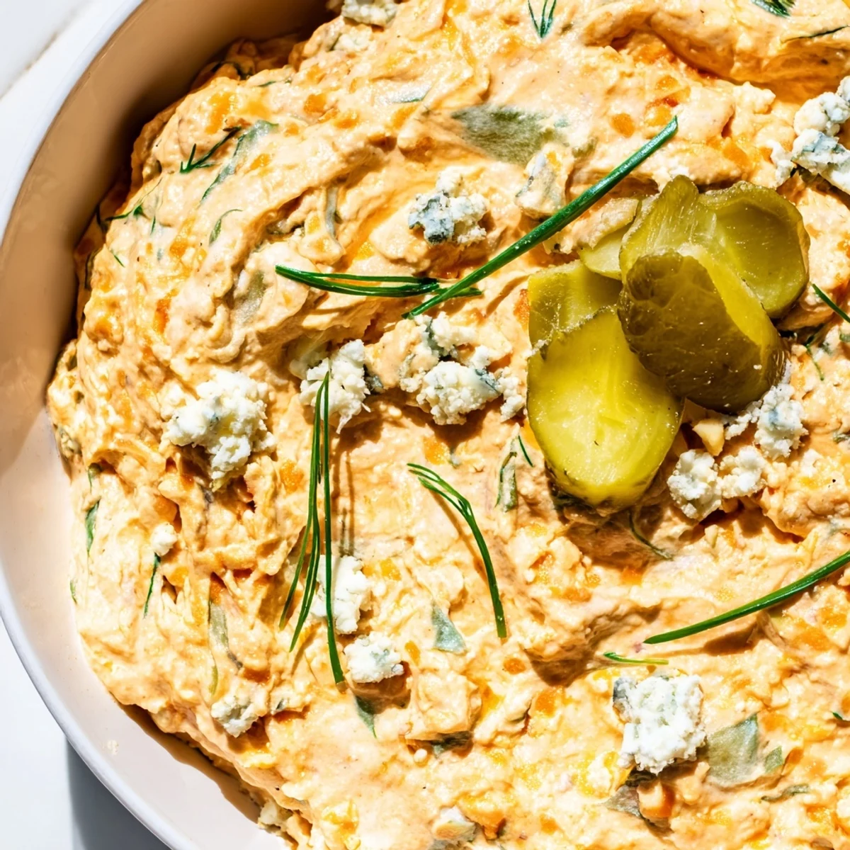This tangy, creamy appetizer combines the bold kick of buffalo wing sauce with the crunch and zest of chopped dill pickles. A smooth cream cheese, sour cream, and mayonnaise base provides the perfect canvas for shredded cheddar and optional blue cheese crumbles. Fresh chives, garlic powder, and black pepper round out the flavor profile. Ready in just 10 minutes with no cooking required, this dip serves eight people and stays fresh in the refrigerator for up to two days. Serve with your favorite dippers like potato chips, pretzels, carrot sticks, celery, or even stuff it into celery boats for a classic presentation.