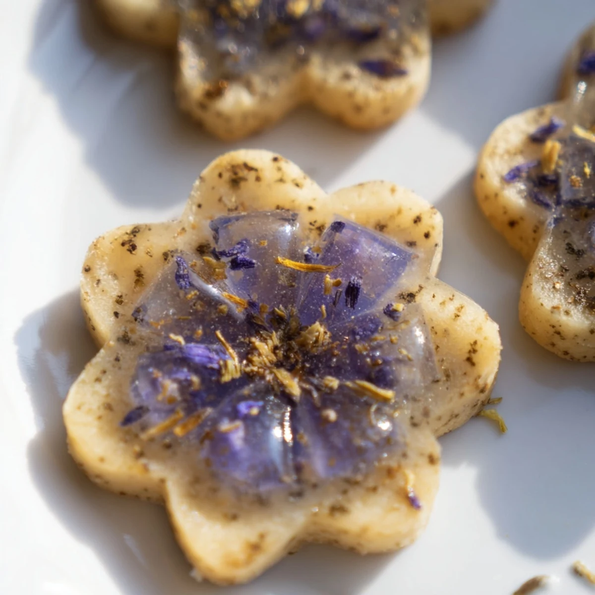These elegant cookies combine the aromatic sophistication of Earl Grey tea with a mesmerizing stained glass effect. The tender, fragrant dough gets infused with finely ground tea leaves, while cut-out centers filled with crushed vegan hard candies create beautiful translucent windows. Edible flowers pressed into the melted candy add an enchanting botanical touch.