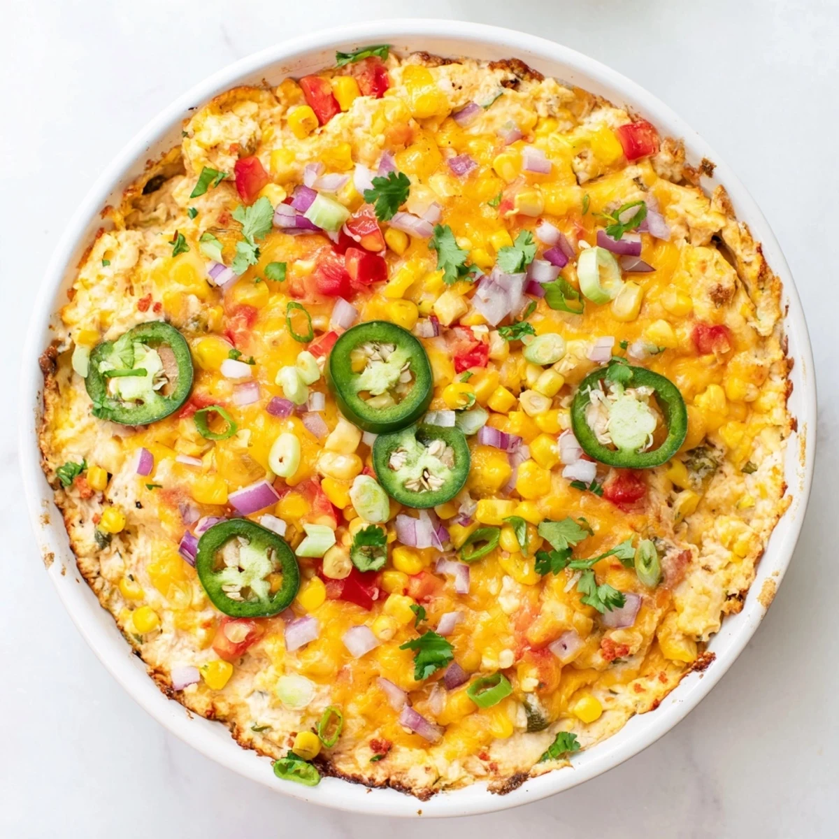 This rich, indulgent dip combines the smoky heat of roasted jalapenos with a velvety blend of cream cheese, sharp cheddar, and Monterey Jack. The southwestern flair comes through with corn, red bell pepper, red onion, and aromatic spices like smoked paprika and cumin. After roasting the peppers to deepen their flavor, everything gets mixed together and baked until bubbly and golden. The result is a warm, cheesy dip that balances creaminess with just the right amount of spice. It's an ideal centerpiece for parties, game day spreads, or casual get-togethers where guests can gather around with chips, crackers, or fresh vegetables.