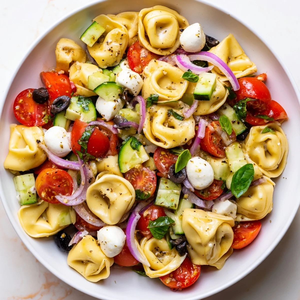 This refreshing tortellini salad combines tender cheese-filled pasta with crisp cherry tomatoes, cucumber, bell pepper, red onion, and black olives. Fresh mozzarella and basil add brightness, while a homemade zesty Italian dressing ties everything together.