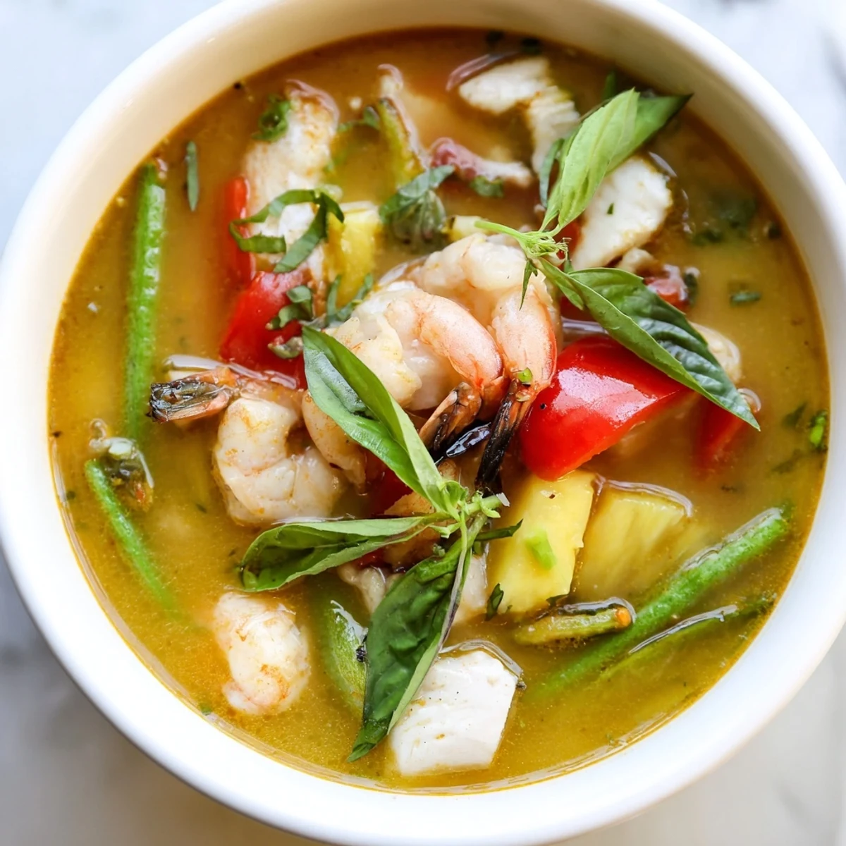 This traditional Vietnamese soup combines tender white fish and shrimp with sweet pineapple, tomatoes, and crisp vegetables in a tangy tamarind broth. The perfect balance of sweet, sour, and savory flavors comes from fish sauce, fresh herbs like Thai basil and sawtooth coriander, and a squeeze of lime. Ready in 40 minutes, this gluten-free soup is typically served with steamed jasmine rice or vermicelli noodles for a complete meal.